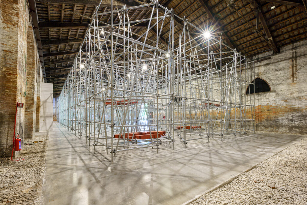 Winner of the Golden Lion for Best National Participation, the Australian Pavilion presents “kith and kin,” an emotionally powerful installation by Archie Moore. Inside, a memorial stretches up to the ceiling, resembling a celestial map, tracing the artist’s genealogy and his ties with the First Nations, covering over 65,000 years of history and 2,400 generations.