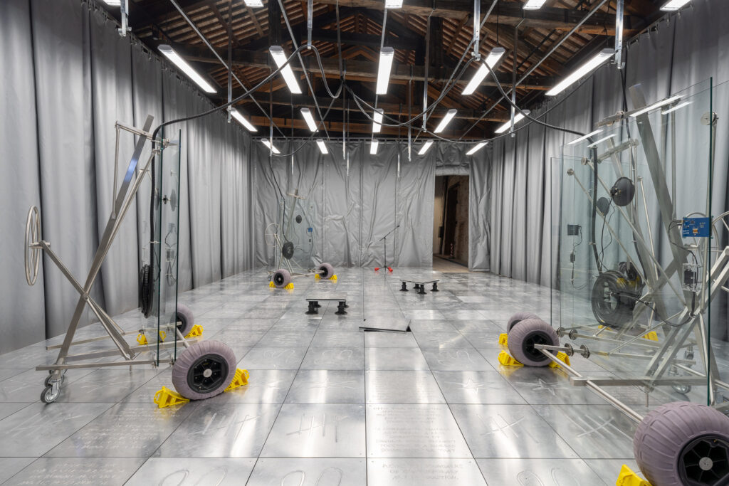 Above large speakers, metal tiles are placed, engraved with exhibit notes, which subtly vibrate under the effect of sound waves. The Luxembourg Pavilion thus transforms into an acoustic transmission plant. The four structures, referred to as “sound walls,” are central in the installation created by artist Andrea Mancini with the collective Every Island.