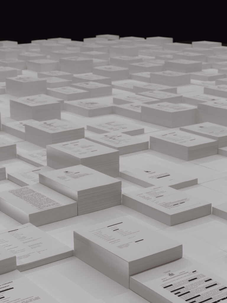 The pavilion includes a water-filled moat where official documents float, reflecting Moore’s commentary on the high incarceration rates of First Nations populations. In this silent yet eloquent exhibition, Archie Moore invites visitors to contemplate fragility and loss while offering hope for redemption and recognition.