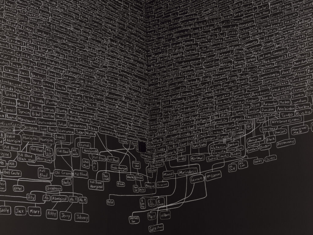 The hand-drawn genealogical chart also highlights the painful erosion of First Nations languages and dialects lost due to colonization. The presence of blank spaces between names, signs of actual erasure, becomes a powerful symbol of the atrocities endured by these communities. The terms “kith” and “kin,” originally linked to concepts of belonging and origin, now mean “friends and relatives,” echoing this loss of meaning and identity.