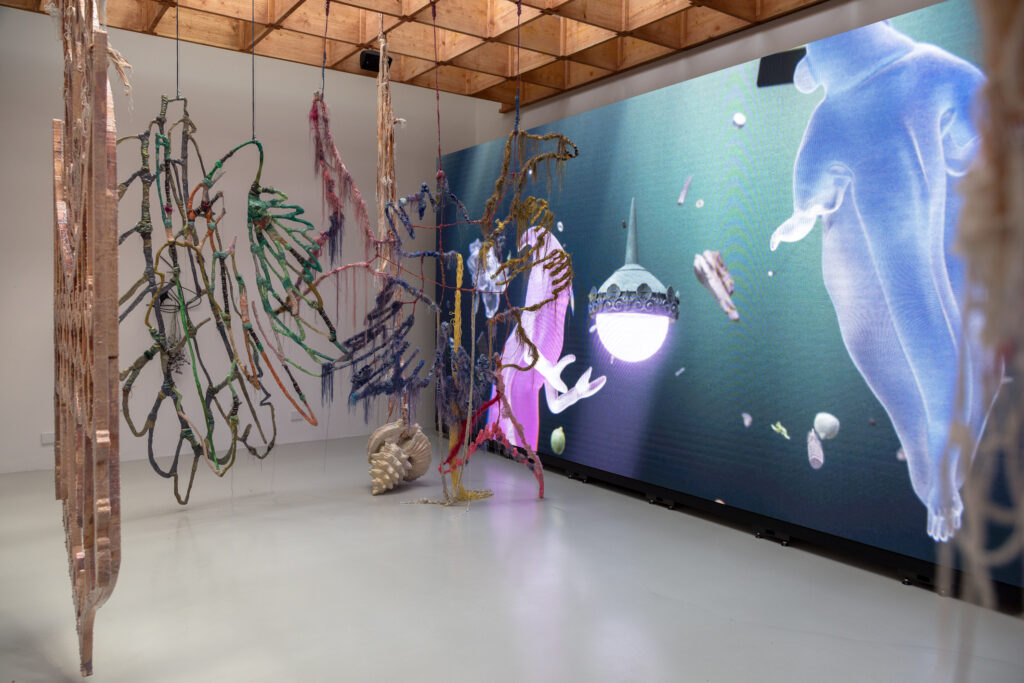 The installation consists of over eighty sculptures, including colourful nets hanging from the ceiling like seaweed and plant-like shapes that appear to float in the air, creating an atmosphere of deep connection with the sea. In the background, large screens animate mythical creatures that move, inviting visitors to approach their reality, reconciling the senses with a universe of extended and interconnected meanings.