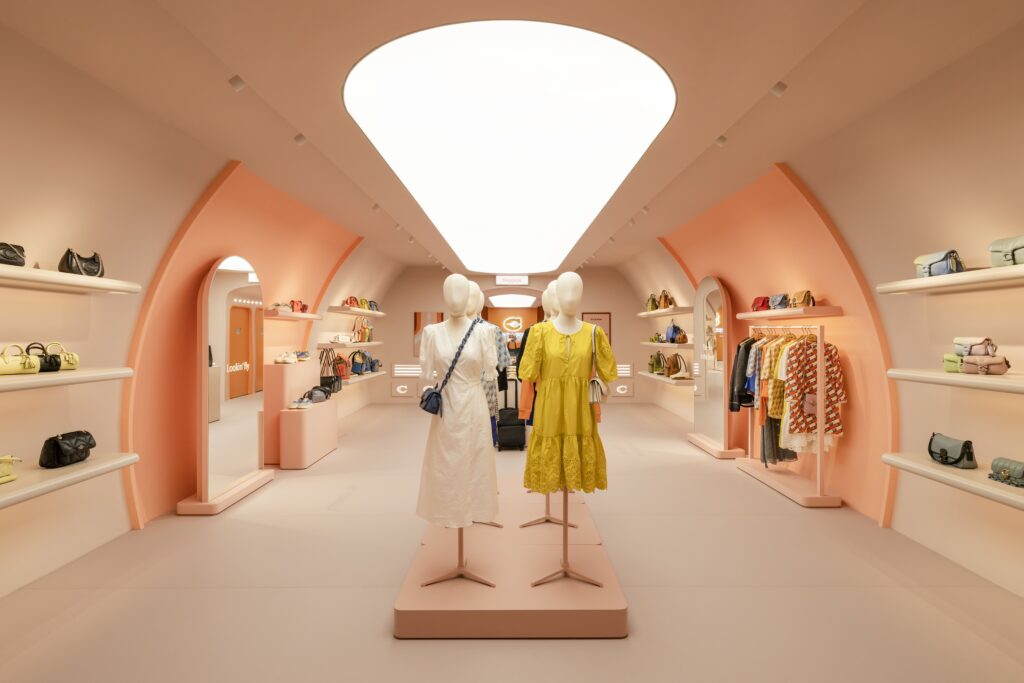 Each of the four spaces in Coach Airways offers a distinct function, guiding visitors on a journey through time. The first area features a faux two-seat cockpit with monochromatic flight controls and yokes, followed by 12 retro-style seats. The project’s standout features include curved walls, rounded furnishings, and a pastel colour palette. These areas are designed as expansive showrooms, allowing visitors to browse and try on clothes comfortably.