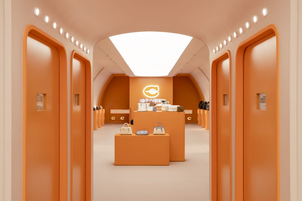 Additional lighting features include decorative signage with messages like “Fly in Style” or “Baggage,” indicator lights between cabins, and the Coach New York logo, enhancing the space’s unique identity. In the commercial areas, hidden spotlights in the false ceiling are carefully positioned to highlight the products on display.