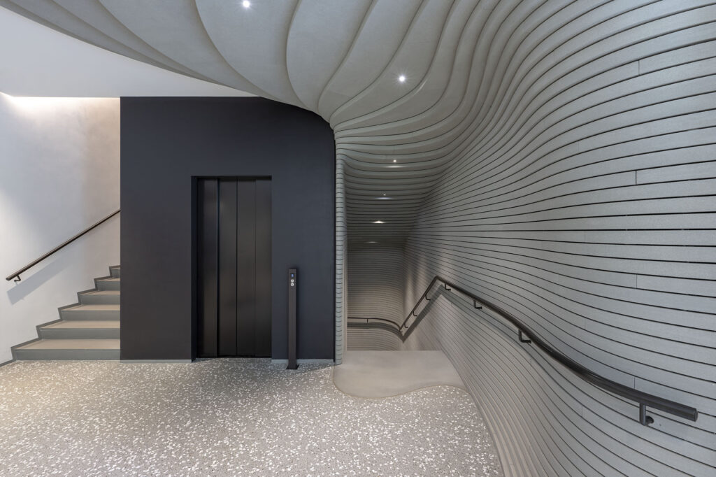 A stunning carved serena stone staircase leads to the subterranean space. Visitors are drawn into a dimly lit space seamlessly lined by skilfully layered stone slabs throughout the exhibition route.