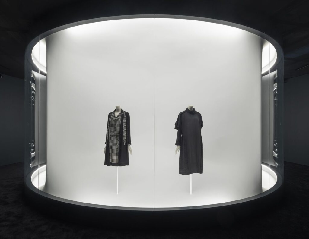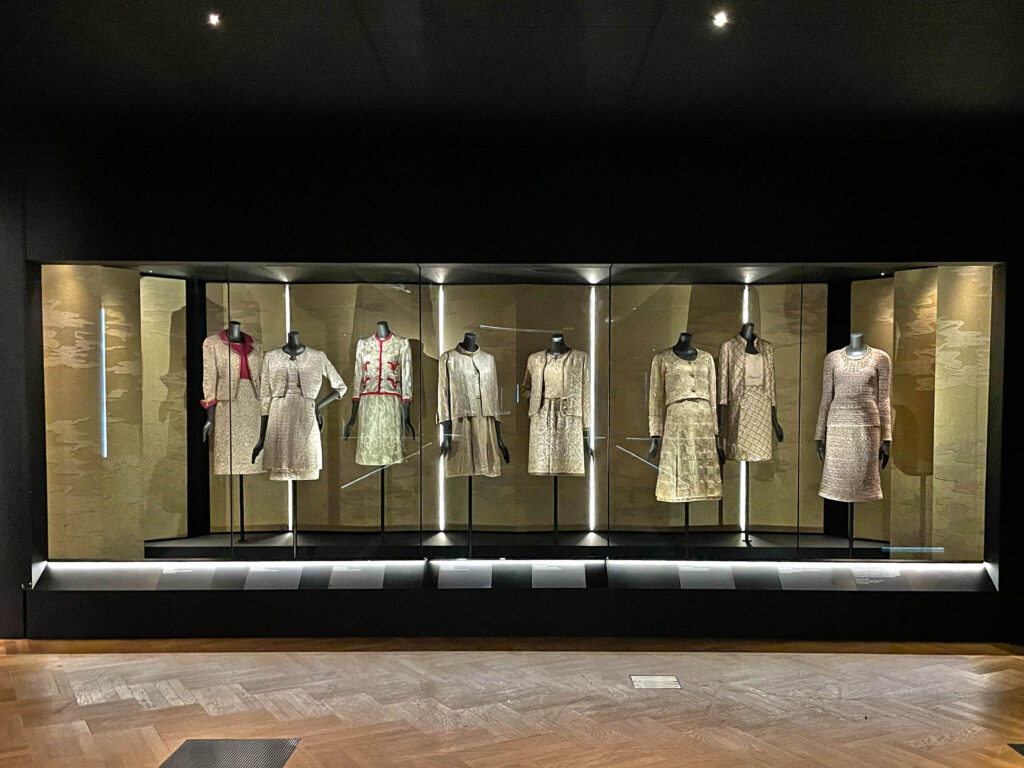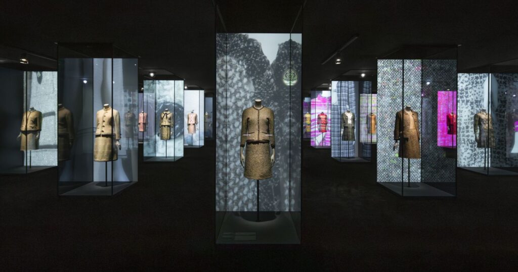 This high-tech lighting highlights Chanel’s iconic pieces, including her signature braided tweed suits and quilted 2.55 bags, while smoothly transitioning between the exhibition’s two chronological sections, covering sixty years of her work.