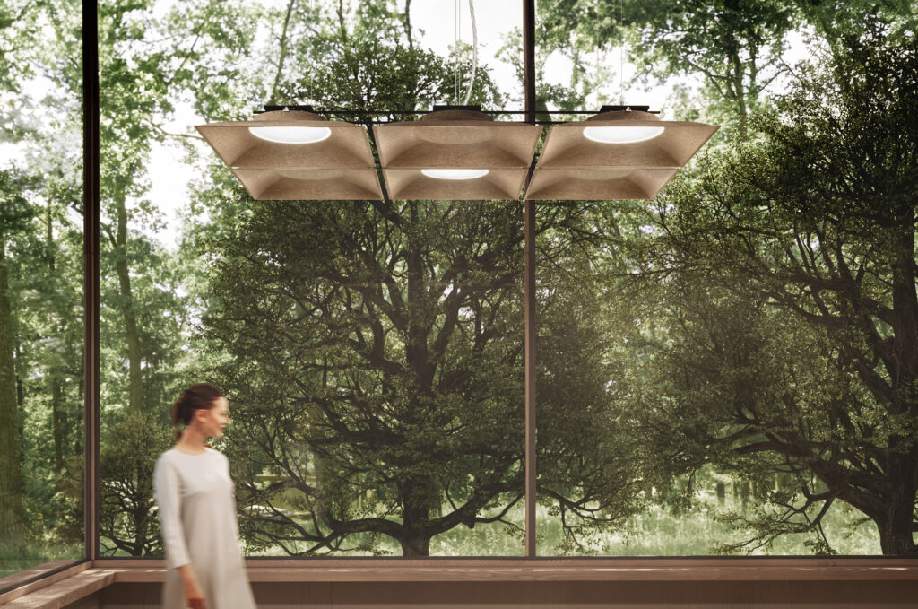 The first professional lighting product made of linen, this green innovation uses recyclable, durable, and stable biological material for its structure. Developed in collaboration with ChIP (Chemistry Interdisciplinary Project) at the University of Camerino (MC, Italy) and MARLIC (Marche Applied Research Laboratory for Innovative Composites), it includes square modules that can be placed side by side and sensors to optimize the balance between natural and artificial light, minimizing energy consumption. Light Shed Linen is also ready to support speakers, cameras, or environmental sensors, making the space pleasant and secure.