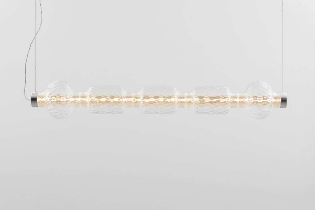 Neil Poulton explores for Pregnana’s brand the potential of blown glass with the ancient balloton technique, playing with transparency and texture to control and diffuse light. The rounded diffusers are supported by an extruded aluminium structure, the technological heart of the lamp, which integrates LED circuits on four faces, protected by a fluted glass cylinder that softens the view. The suspension is available in horizontal and vertical versions in two lengths.