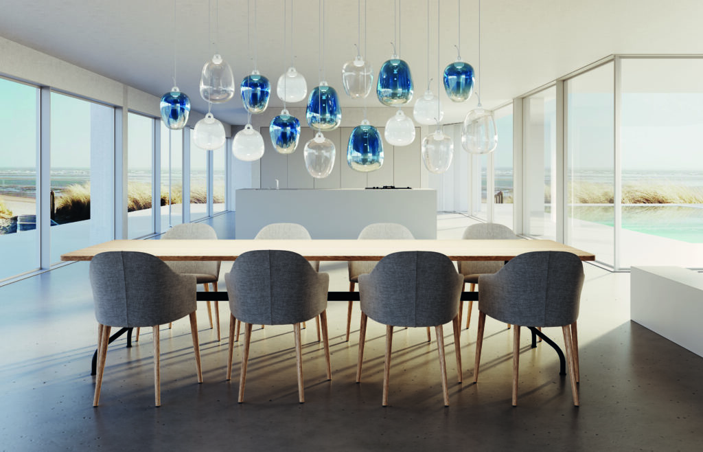 Born from the collaboration with Paola Navone – OTTO Studio, this pendant lamp made of Pyrex features shades ranging from iridescent to metallic blue, silk white, glossy smoke, and transparent, evoking marine imagery and the play of light on water. “Oblò is a fun family of lamps that bring the sensations of the sea,” says Paola Navone. “The diffuser is suspended by a knotted cable, giving it the appearance of floating like a buoy. The cable powers a hidden LED that illuminates the diffuser. So, you only see the glass, just like looking through a porthole.”