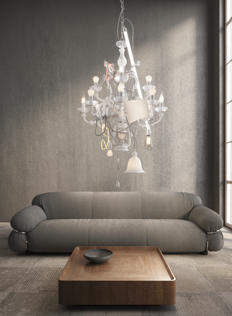 This new chandelier by Marcantonio reinterprets the classic chandelier while playing with the concept of order, subverting it. All the canonical elements are present—the supporting structure, arms, bulbs, and cable—but the designer’s trademark rebellious touch is evident in the seemingly random and deconstructed assembly of the pieces. The arms are in Murano glass with Bohemian crystal rosettes, and among the pendants, you can spot the silhouettes of a lampshade with a fabric shade, a wall lamp, a neon effect bar, and even a little fish and a heart that lights up pink.