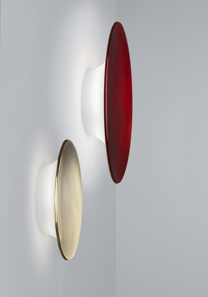 This minimal applique takes a decidedly unconventional approach: it uses the wall as a reflector. The disc detaches from the wall, creating a luminous halo, with the light source housed in an opaline body and the front in polished aluminium in red or gold. Designed by Oscar and Gabriele Buratti, it comes in two diameter options: 36 cm and 48 cm.