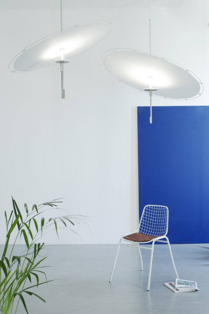 The suspension lamp by Belgian designer Nicolas Verschaeve is characterised by its remarkable lightness. The disc-shaped diffuser, crafted from a technical fabric by Serge Ferrari designed for the nautical sector, provides a reflective and diffusing surface for the integrated LED source. By rotating or pulling the three central cylinders, you can easily adjust the height and tilt of the disc, allowing you to modulate the reflected light intensity and create varying atmospheres.