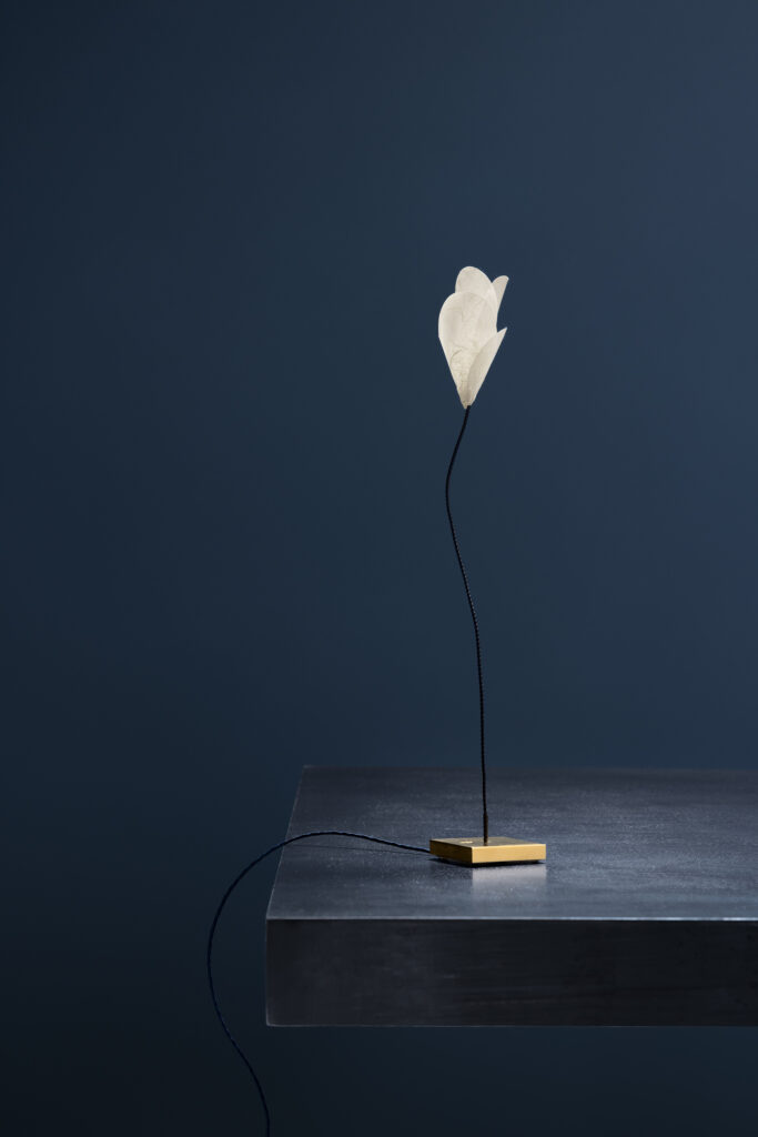Poetic and light, this table lamp by Enzo Catellani is a luminous flower designed to be gifted. The small brass base features an integrated push-dimmer; the stem, covered in blue fabric, is adjustable and supports a rice paper diffuser, inside which, like a pistil, a small LED is installed.