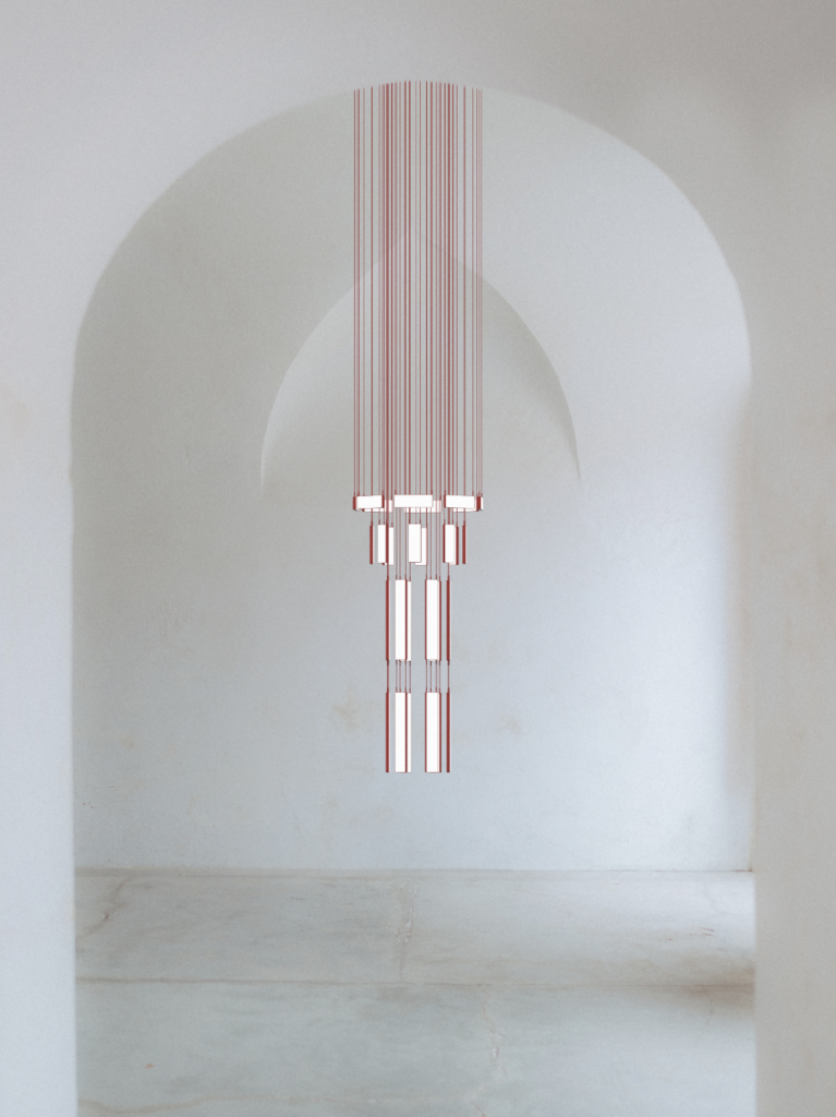An innovative modular chandelier, designed by Alessandro Zambelli, is constructed from a rectangular module where the four corners are crucial for connecting multiple elements. The electrified cables transmit polarity to these corners, ensuring uninterrupted electrical continuity. Depending on the arrangement, the chandelier can take a traditional or contemporary aspect.