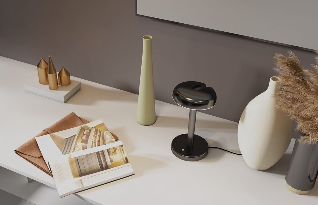“The idea was to create a nomadic desk lamp that could be easily moved and adapted to one’s needs. We wanted a product with which the user could establish a near-daily relationship, moving or adjusting it throughout the day. The use of magnets came as an insight from the prototype we made. Starting with rectangular bases, we thought of inserting magnets to hold them in specific positions. From there, everything fell into place naturally. In production, the two bases were made in ABS, a good thermoplastic material, but we kept the idea of magnets to allow for customizable light direction.”