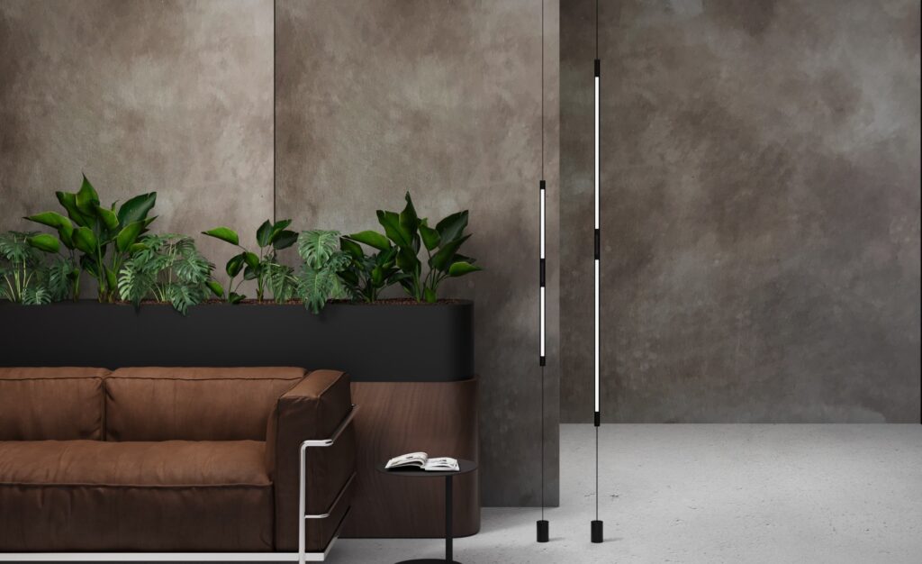 Flutua è un interessante ibrido tra piantana e sospensione, un binario che integra sorgenti luminose e che si muove su un sottile sostegno metallico, ancorato a soffitto e dotato di contrappeso a terra. Il movimento traslante è possibile grazie a un accessorio posto nella parte centrale del sistema, che consente cambi di quota; questa “maniglia bloccante” è anche un dettaglio estetico, unica concessione alla decorazione di Flutua, ed è declinato in quattro colori vitaminici (blu, giallo, viola e arancio).