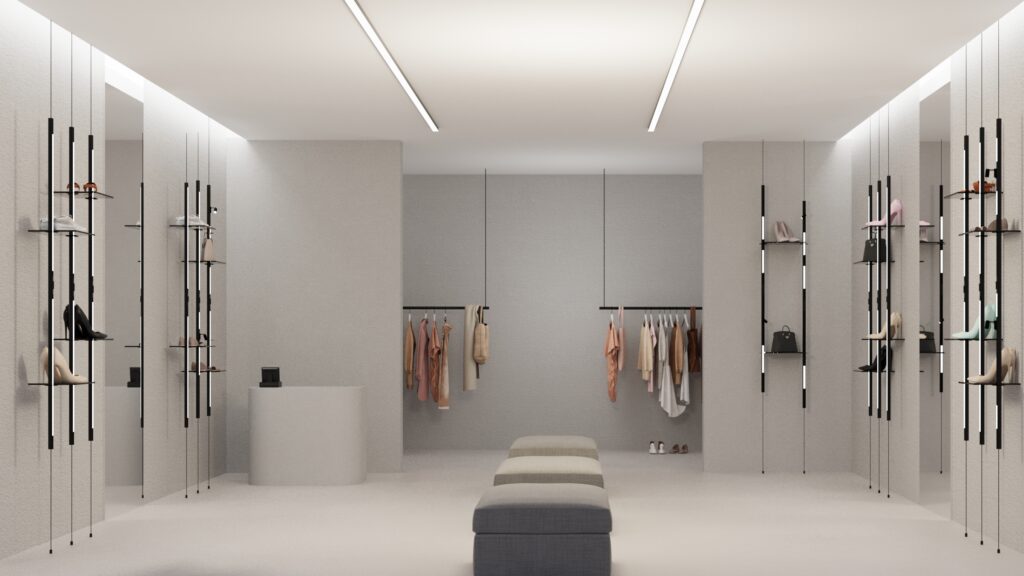 «L’aspetto più innovativo è sicuramente il fatto che Flutua si muova come un binario, rendendo di fatto il cavo d’acciaio la struttura portante del binario tondo, che sembra fluttuare nello spazio. Altri aspetti importanti sono gli accessori, come le mensole espositive che si agganciano alla struttura e consentono nuove differenti applicazioni del prodotto, o la maniglia ergonomica di sblocco e blocco immaginata in diverse finiture».