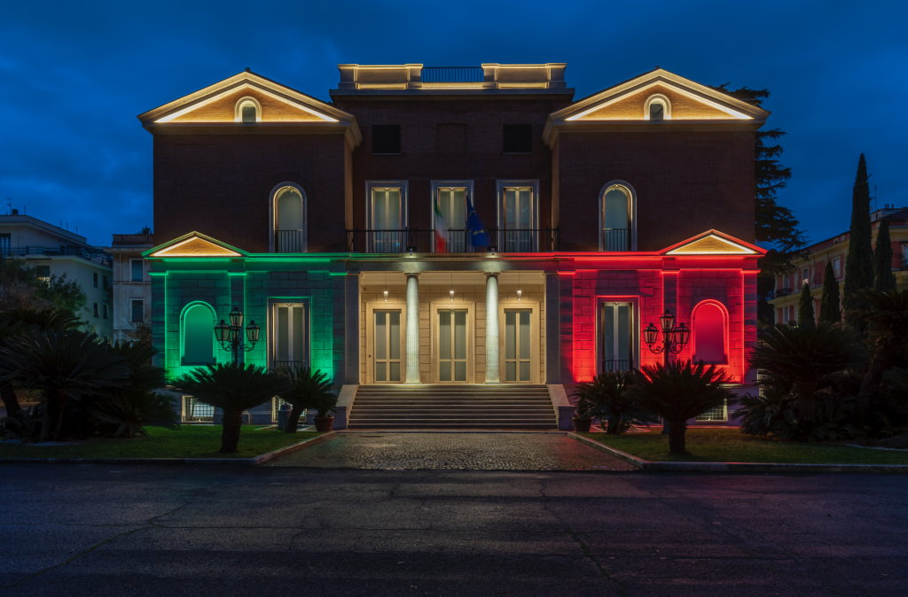 1. Illuminazione della facciata principale della villa, sede di SDA Bocconi a Roma - ph. © Moreno Maggi