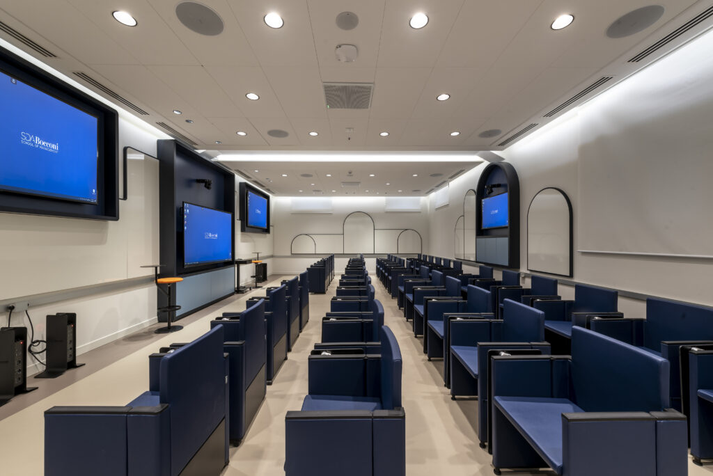 Per le aule, controllate da interfaccia Creston (che gestisce audio, video e luce) sono state create scenografie luminose adatte a ogni esigenza, dalla configurazione di didattica standard a scene per video proiezioni, sino alla configurazione per briefing.