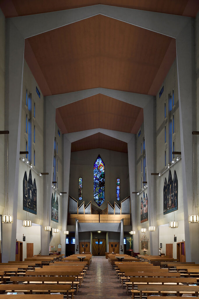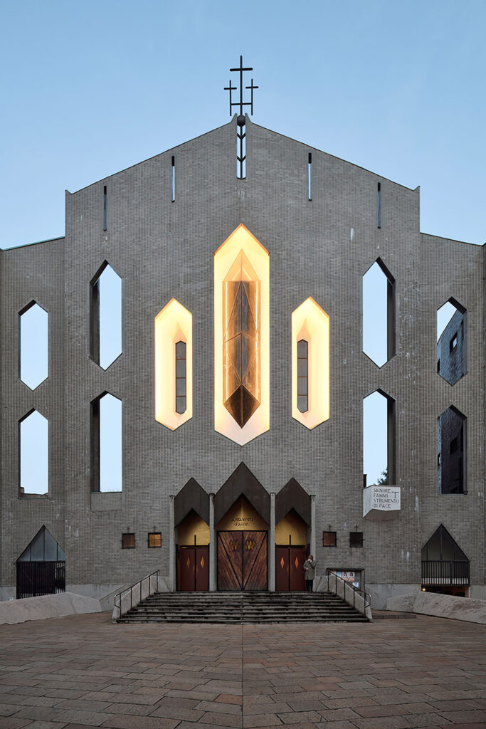 Il risultato è un edificio arretrato rispetto alla strada, che crea una piccola piazza utilizzata ancora oggi come sagrato. La facciata fa parte di un’unica struttura che collega la chiesa agli edifici parrocchiali, formando un fronte urbano unico caratterizzato da aperture esagonali simili a losanghe. Otto di queste, aperte incorniciano il cielo retrostante, mentre le tre centrali, chiuse da vetrate, rivelano lo spessore del muro.