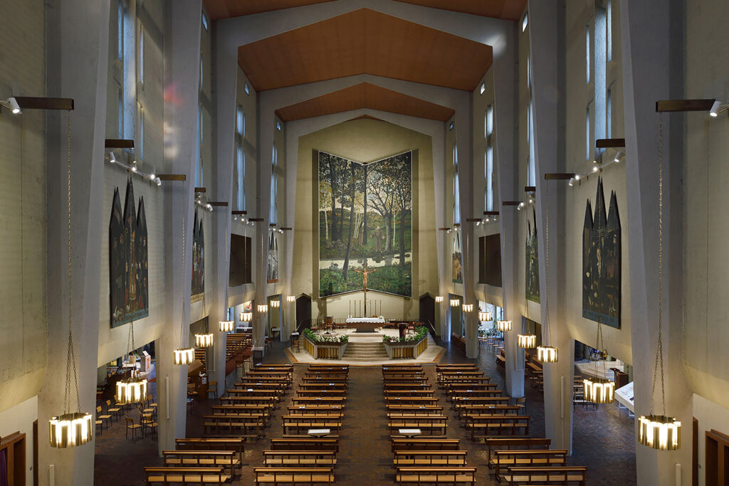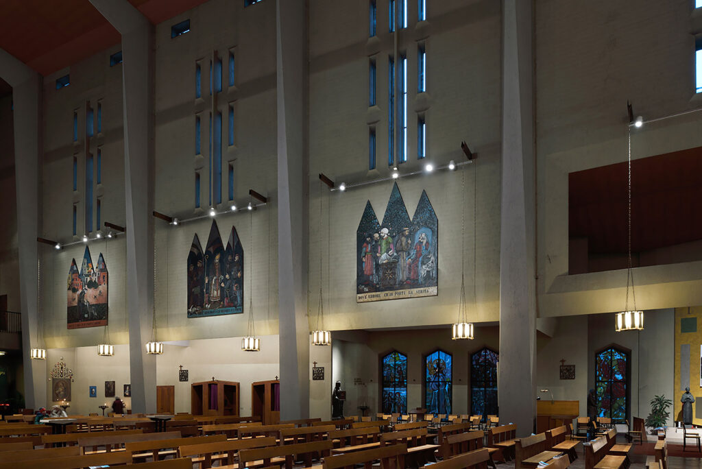 I venti lampadari in ottone della navata centrale furono sostituiti negli anni ’80 per implementare altri apparecchi che aumentassero la resa luminosa. I proiettori a ioduri metallici, molto potenti, hanno alterato completamente il concetto spaziale e l’atmosfera raccolta voluti in origine da Ponti. Inoltre, i lampadari stessi hanno subito nel tempo una progressiva ossidazione, perdendo così la finitura leggera ed elegante che li caratterizzava.