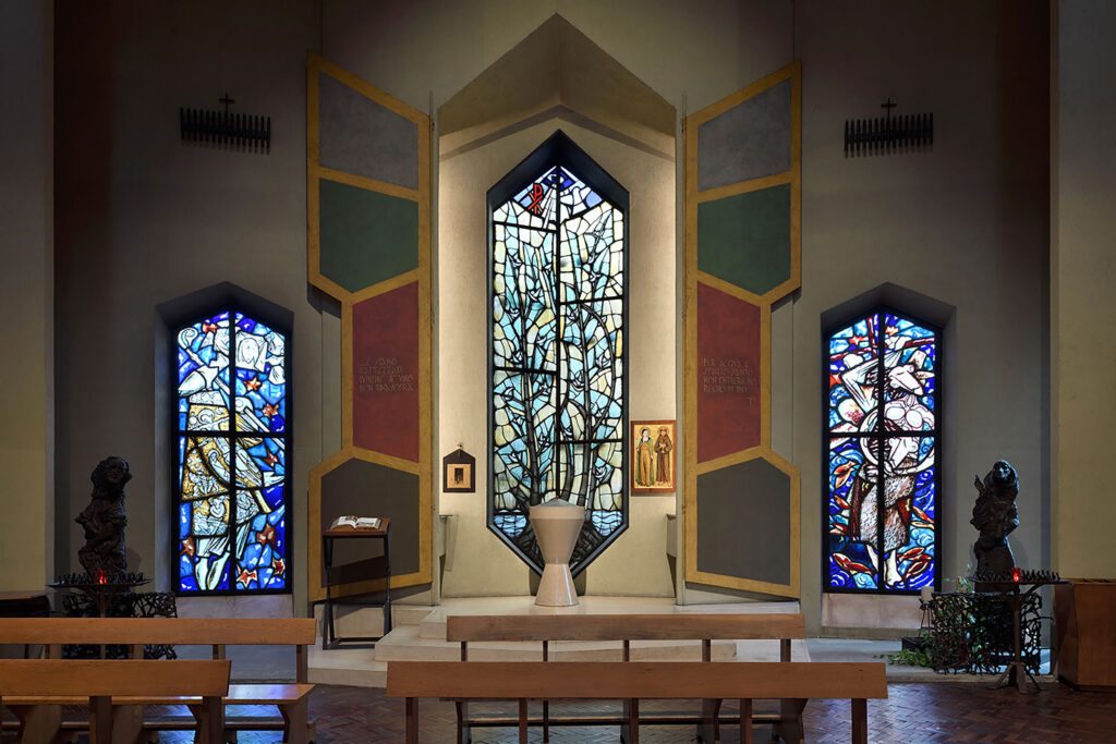 A Milano, in via Paolo Giovio al civico 41, si apre una piazzetta incorniciata da una facciata davvero speciale. Si tratta della Chiesa di San Francesco al Fopponino, progettata da Gio Ponti nel 1961. Ponti fu incaricato dall’Unione Commercianti di Milano di progettare una chiesa con centro parrocchiale che si integrasse armoniosamente sia con i vincoli naturali del terreno sia con la chiesa seicentesca preesistente.