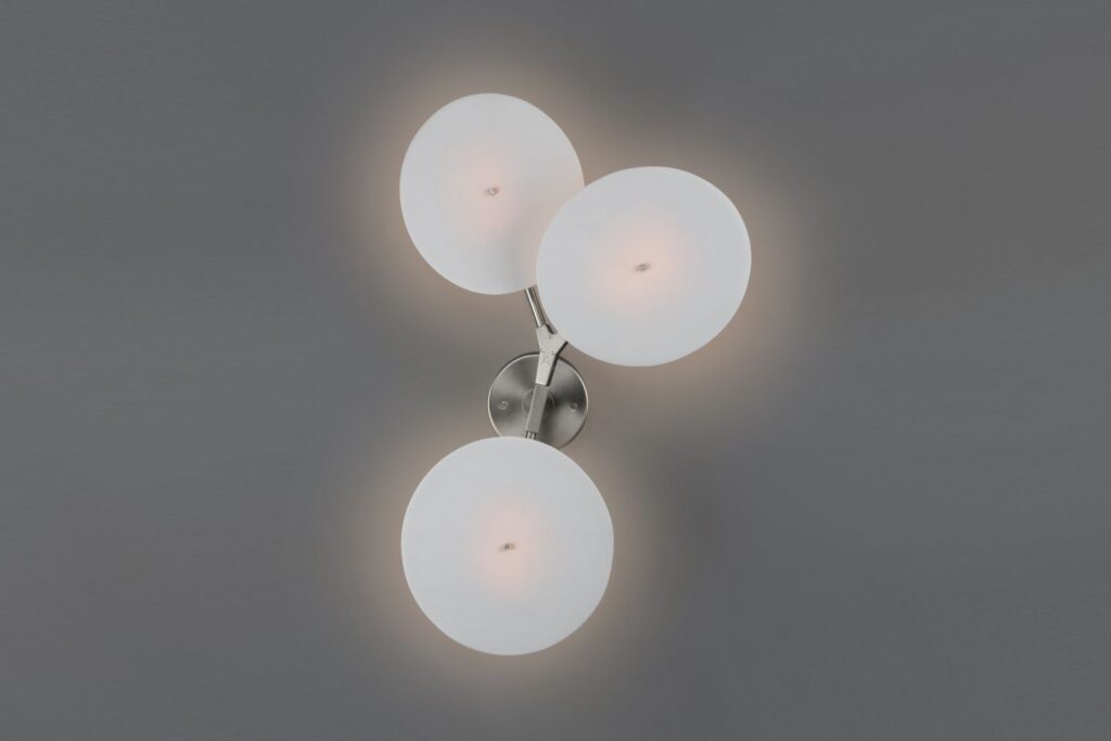 Among Adelman’s most iconic designs is the Branching Bubble chandelier, a modular system that has become a hallmark of high-end interiors. Available in various configurations, the chandelier’s hand-blown glass globes appear to float on slender brass limbs, casting a warm, diffused glow. The imperfections in the glass make each piece unique, as if the fixture is alive and breathing within the space it occupies. In contrast, the Branching Disc collection takes a more horizontal approach, with delicate porcelain scallops that hover and float, evoking the sensation of sunlight filtering through leaves.