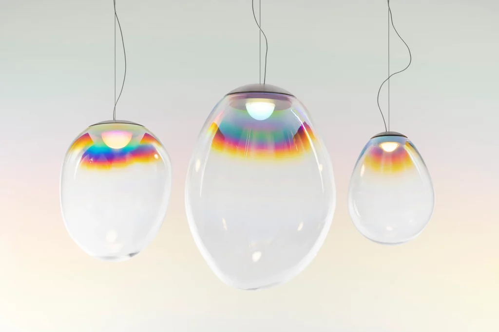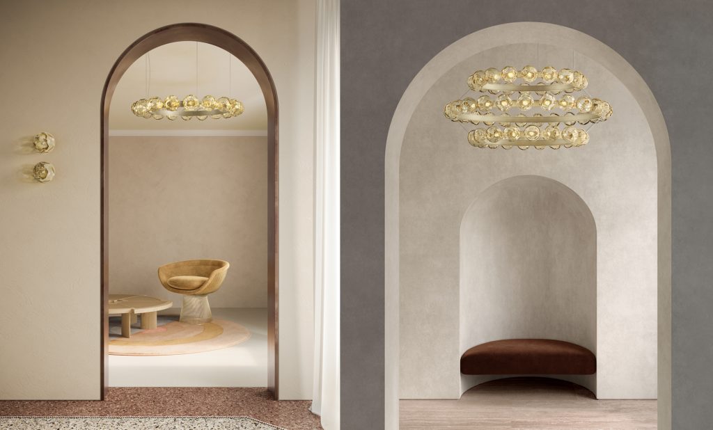 The one for glass is a passion that has never been completely extinguished. Whether transparent or opaque, mouth-blown in Murano furnaces or industrially processed, it has always been shaped into ever-changing forms to create striking chandeliers. Today, designers are betting on renewal, focusing everything on glass elements with a contemporary spirit. Murané by Panzeri, designed by Matteo Thun with Benedetto Fasciana, has bronze-colored pallettes handcrafted to achieve an unusual wavy effect. Kundalini’s Bolha pendant lamp is a sphere that contains a contrasting decorative element; the outer borosilicate glass is transparent, the inner part that serves as the diffuser is of darker blown glass. The experimentation of the Danish architectural firm BIG-Bjarke Ingels Group, which designed Stellar Nebula for Artemide, is of great interest. This modern chandelier reinterprets and enhances the artisanal glassblowing process that gives life to unique and ever-changing shapes by combining it with innovative PVD (acronym for Physical Vapour Deposition) finishing techniques that give the suspension its characteristic iridescent finish.