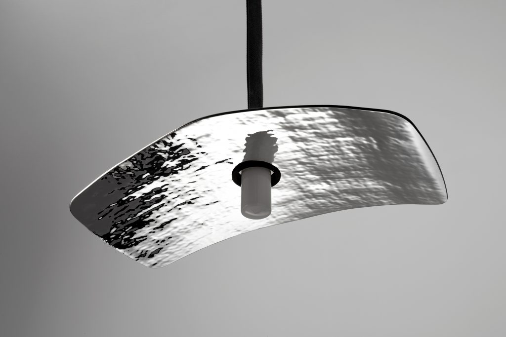 For the French brand Radar Interior, Samuel Accoceberry signs Solar. The diffuser is a sheet of thermoformed glass that in the suspended version is held by a fabric strap, while in the wall-mounted version it can be mounted horizontally or vertically to a matte black powder-coated metal base. The dimmable LED source is contained in a mouth-blown opaline glass diffuser.