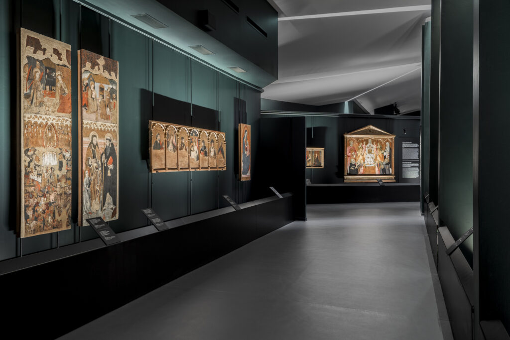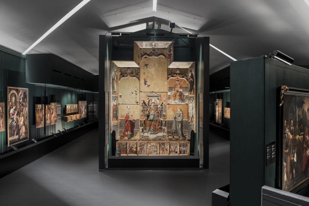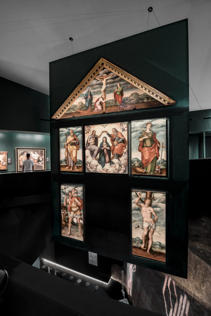 Originally displayed on the lower floor of the Pinacoteca, the St. Christopher altarpiece now takes center stage, suspended in the open space created by the double-height section of the Pinacoteca. This placement allows full visibility of the more than five-meter-tall retable, a solution determined by in-depth structural and exhibition studies.