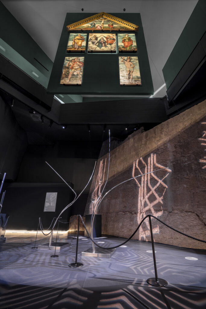 «The suspension», adds Schintu, «is positioned above the area dedicated to contemporary art exhibitions. As visitors explore the underground gallery, they naturally look up, discovering both the Pinacoteca’s architecture and a unique view of the altarpiece. It serves as a **symbolic reminder of contemporary art».