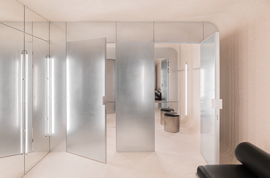 The first phase of reopening took place last February, coinciding with fashion week. On that occasion, the Gallery and Project Room were unveiled—spaces dedicated to books and design as well as temporary exhibitions. Both areas are flexible, modular, and easily reconfigurable thanks to a system of mobile furniture and sliding panels. The retro-futuristic aesthetic highlights raw concrete pillars, exposed and paired with shiny metal surfaces, accented by technical lighting installed between the ceiling beams.