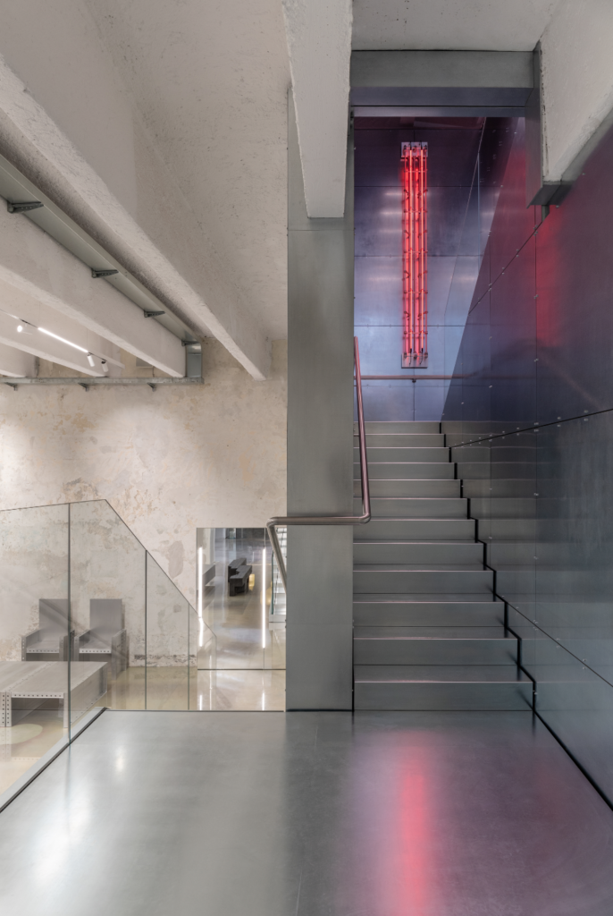 The space’s flexibility is further enhanced by the track lighting system, with spotlights and elements that can be easily switched out, complemented by fixed lighting with LED tubes reminiscent of old neon lamps. A red tube stands out at the centre of the staircase, the only splash of colour in a space that bets on its near-sterile neutrality as its key strength.