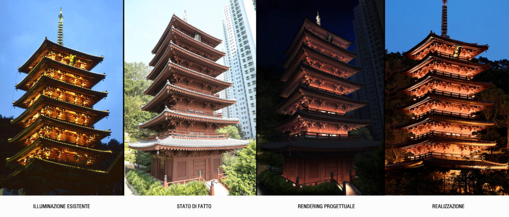 It is within this concept that Marco Petrucci, Mauro Zani and Giulia Chinello developed their lighting engineering project. The two renowned lighting designers from Milan worked on the pagoda with the proper care and respect reserved to one of the landmarks of the nunnery. The original lighting setup consisted of spotlights placed on the external railing surrounding the four sides of the building: the devices clashed with the architecture, due to their size and different colour temperatures.