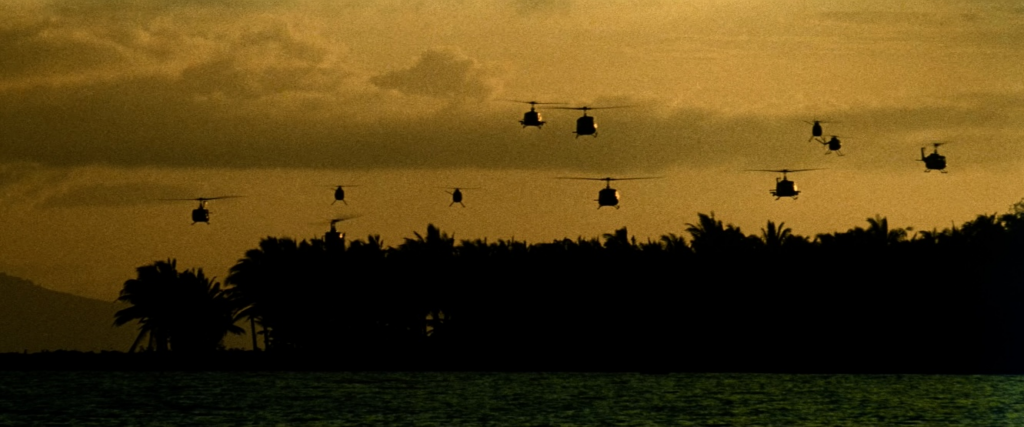 In the film, the yellow of napalm symbolically portrays the violent push of civilization during the Vietnam War, set against the green of the jungle. This menacing, unknown, and boundless setting becomes the abyss for many American soldiers.